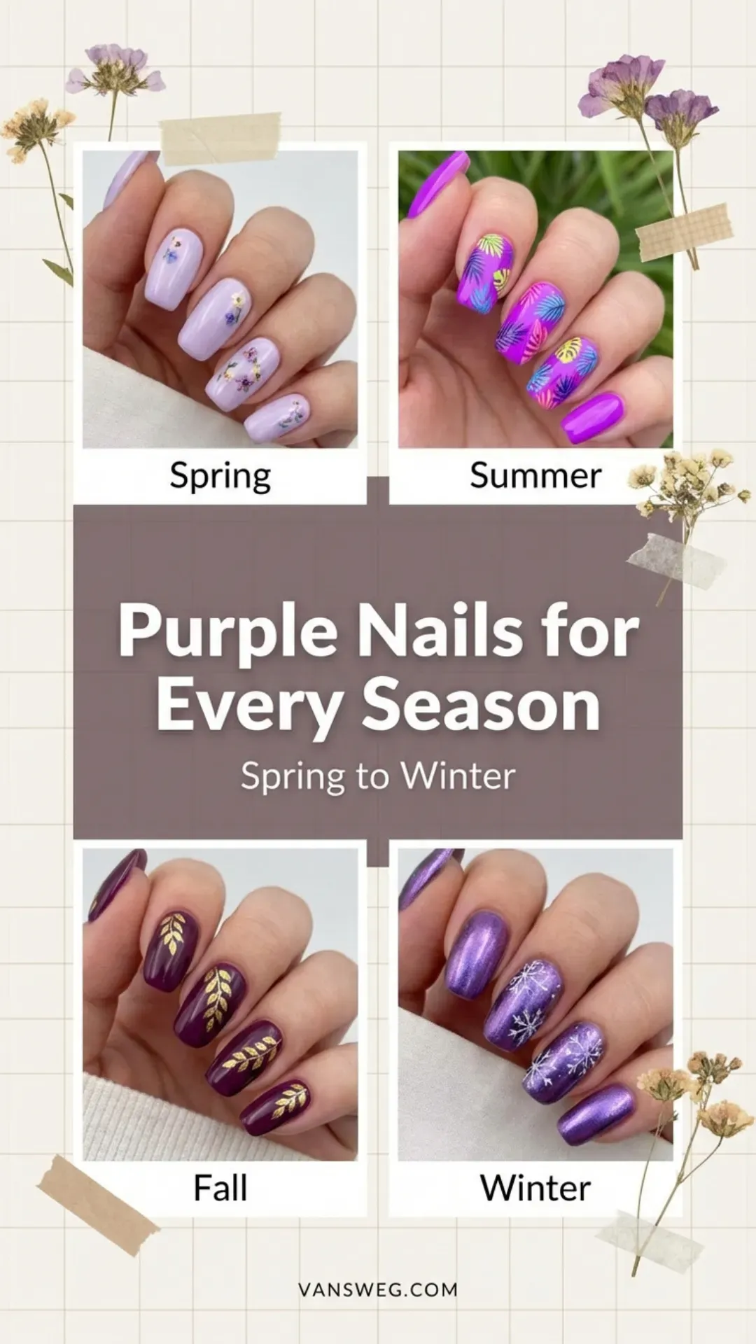 - Winter: Metallic, velvet, and glitter purple nail designs