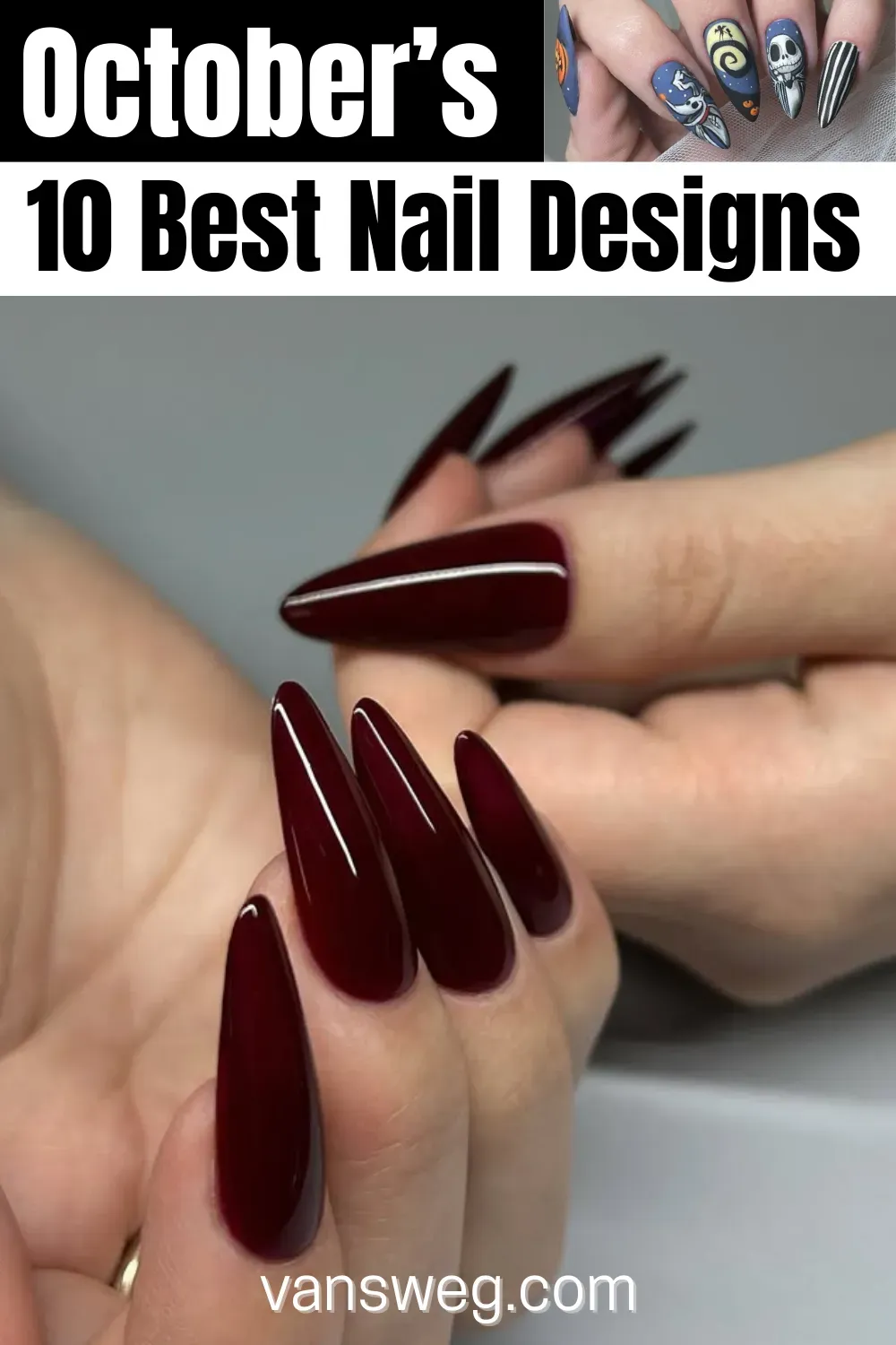 If you're looking to embrace sophistication with a touch of mystery, burgundy nails are a perfect choice. This deep red color offers a stunning, elegant vibe while adding a hint of spooky allure. You can keep it simple or add gold accents for extra glam!