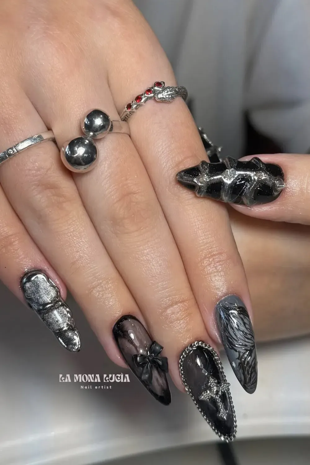 Punk Couture A mix of textures on long nails, including metallic silver, sheer black, and intricate 3D cross and chain details.